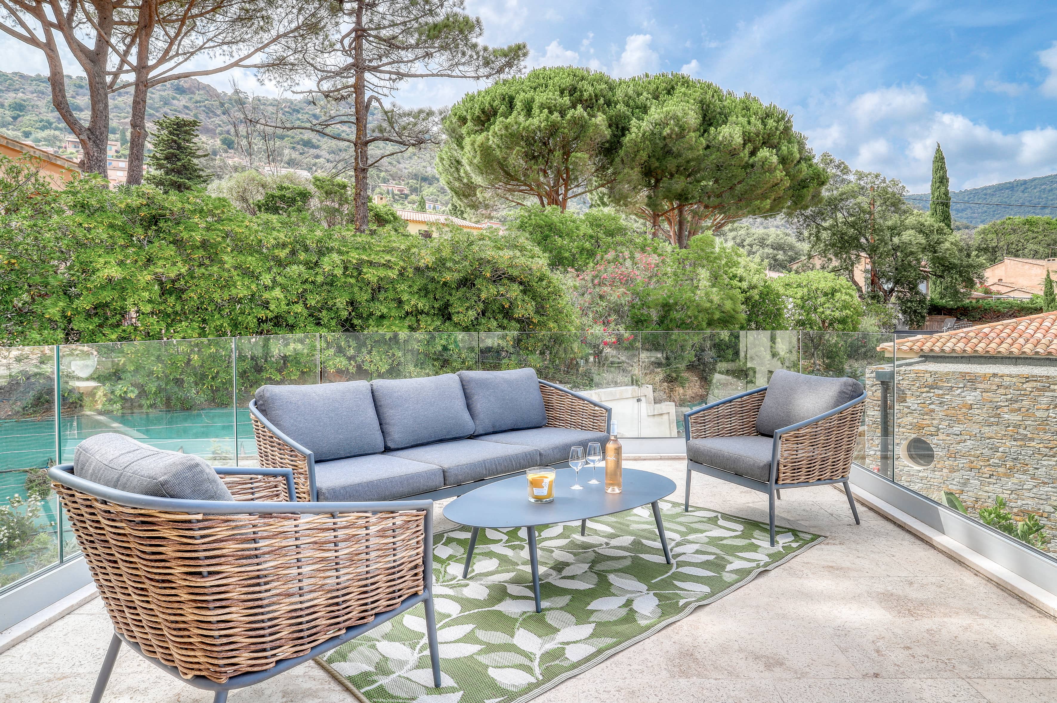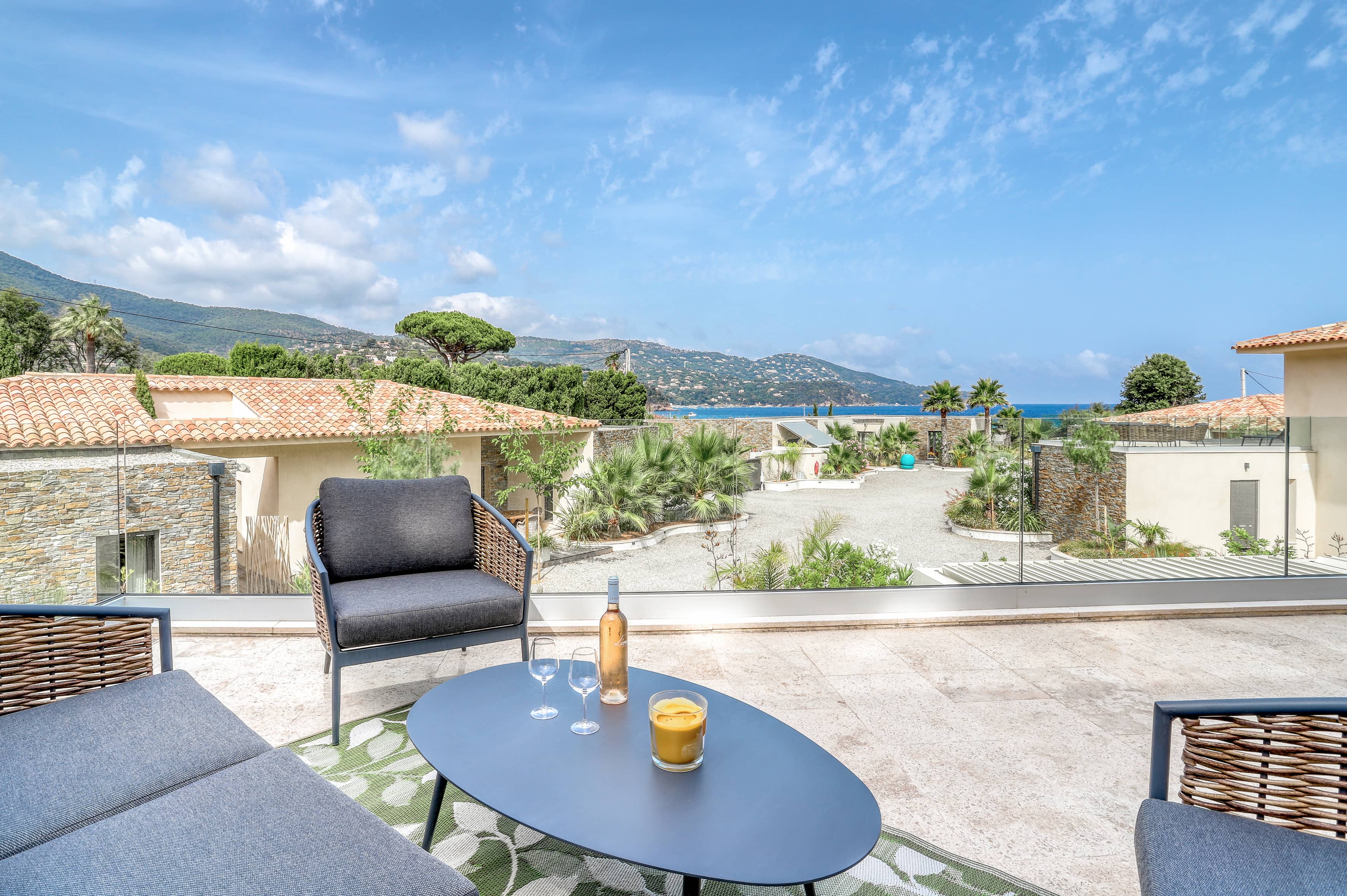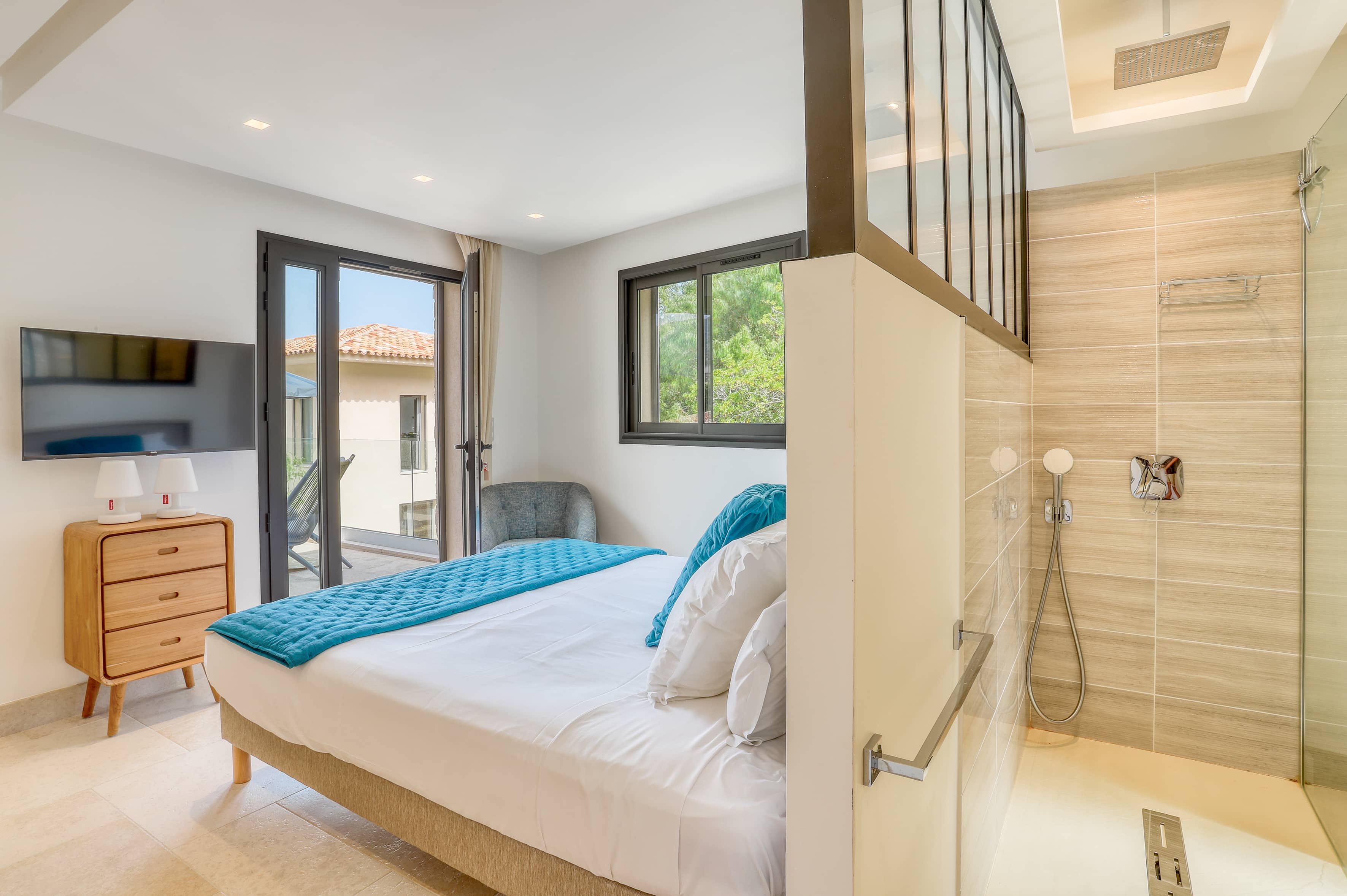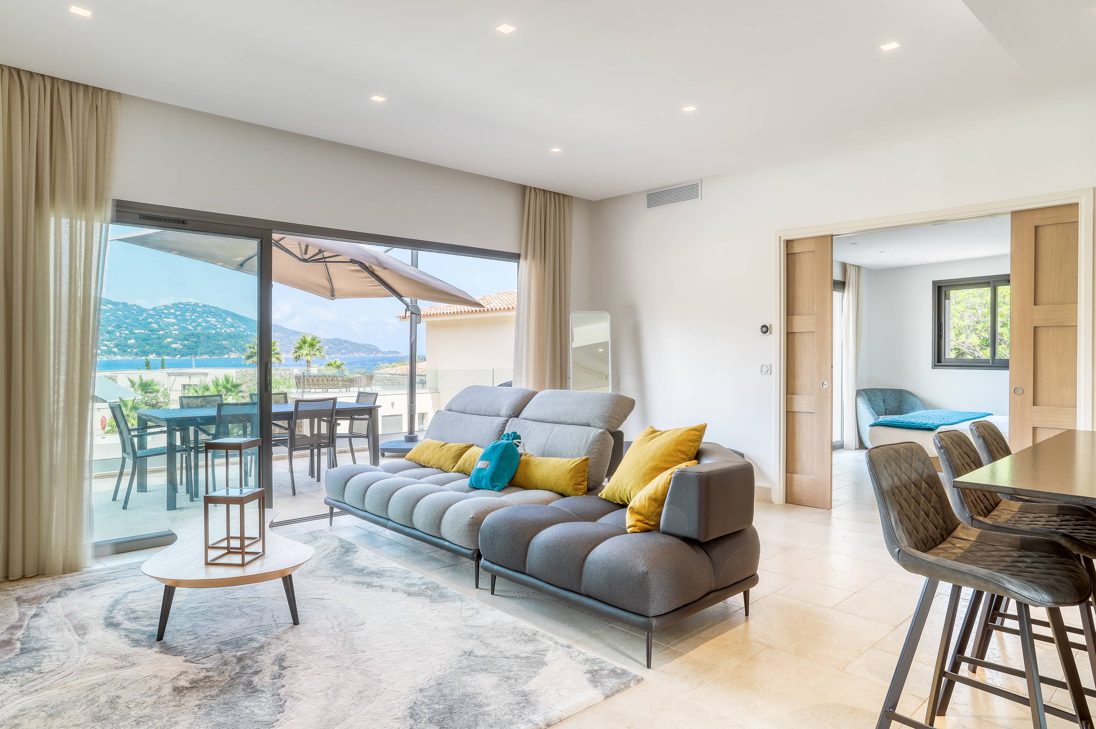 A contemporary villa with chic furnishings and sleek, modern comforts, comprising a main apartment with a 50m² living room/kitchen plus a fully-equipped terrace overlooking the sea. Three bedrooms can communicate with the living room, and four bedrooms have exclusively independent access.
